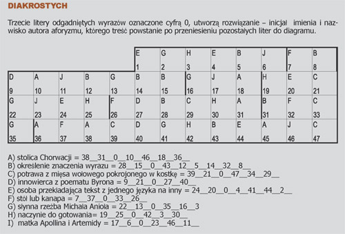 pochodna popularnych szyfrogramów diagramowych oraz logogryfów. Po odgadnięciu zaszyfrowanych wyrazów pomocniczych należy ich litery, zgodnie z przypisaną numeracją, przenieść do daigramu, gdzie utworzą rozwiązanie - aforyzm, złotą myśl, sentencję, fraszkę, fragment wiersza lub wypowiedzi. Pewne, dowolnie określone litery, zazwyczaj pierwsze, trzecie, piąte, leżące na pozycjach biegnących na skos kolejnych wyrazów klucza pomocniczego, dają uzupełnienie rozwiązania: imię i nazwisko autora oraz tytuł utworu.